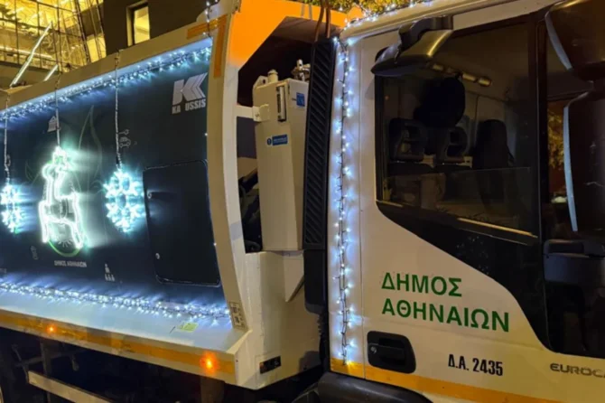 Τα απορριμματοφόρα του δήμου της Αθήνας «φόρεσαν» τα γιορτινά τους και φωτίζουν την αθηναϊκή νύχτα
