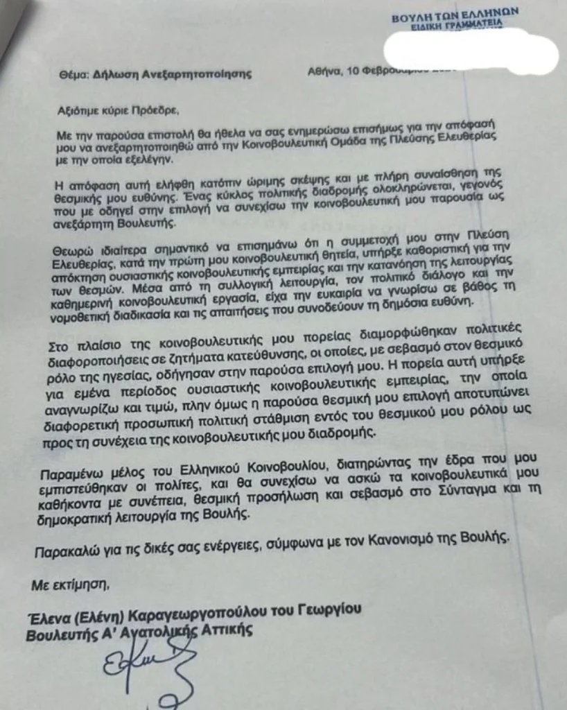 «Στο πλαίσιο της κοινοβουλευτικής μου πορείας διαμορφώθηκαν πολιτικές διαφοροποιήσεις σε ζητήματα κατεύθυνσης και λειτουργίας, οι οποίες με οδήγησαν στη συγκεκριμένη θεσμική επιλογή», τονίζει ακόμα η ανεξάρτητη, πλέον, βουλευτής. «Η επιλογή αυτή δεν συνιστά πράξη αντιπαράθεσης, αλλά πολιτική διαφοροποίηση ως προς την κοινοβουλευτική κατεύθυνση και τον τρόπο άσκησης του ρόλου μου. Παραμένω στη Βουλή για να υπηρετώ με συνέπεια τη λαϊκή εντολή, ασκώντας ενεργό και υπεύθυνη αντιπολίτευση», καταλήγει η Ελένη Καραγεωργοπούλου.