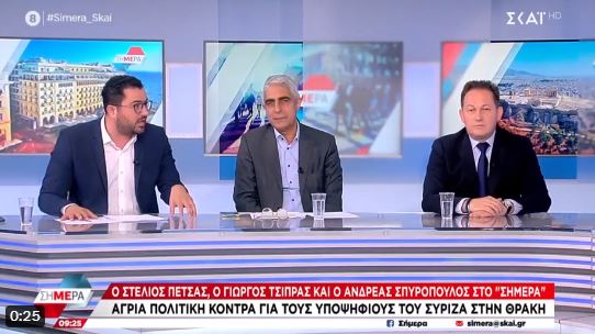 Ο Ανδρέας Σπυρόπουλος, Γραμματέας της Κεντρικής Πολιτικής Επιτροπής του ΠΑΣΟΚ-Κινήματος Αλλαγής εμφανίστηκε στην εκπομπή «ΣΗΜΕΡΑ» της τηλεόρασης του ΣΚΑΪ, με τους δημοσιογράφους Δημήτρη Οικονόμου και Άκη Παυλόπουλο.