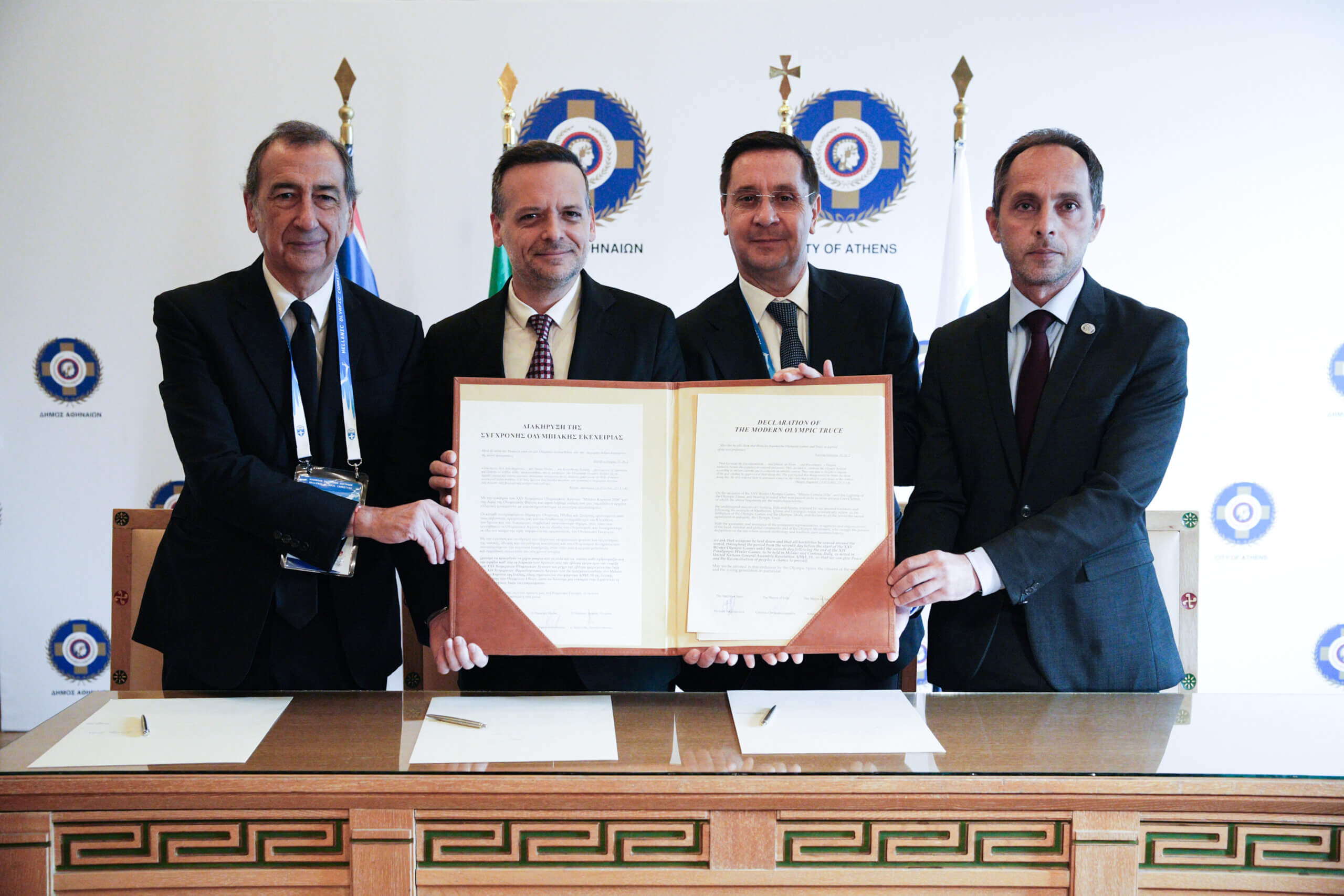 Αθήνα, Μιλάνο, Κορτίνα και Αρχαία Ολυμπία, ενώνουν δυνάμεις για την ειρήνη. Ο Δήμαρχος Αθηναίων, Χάρης Δούκας, υποδέχτηκε στο Δημαρχείο Αθηνών, την Πέμπτη 4 Δεκεμβρίου, τους Δημάρχους Μιλάνου και Κορτίνας, Giuseppe Sala και  Gianluca Lorenzi. Σε μια συμβολική τελετή υπέγραψαν τη Διακήρυξη της Ολυμπιακής Εκεχειρίας, ενόψει των Χειμερινών Ολυμπιακών Αγώνων «Μιλάνο–Κορτίνα 2026». Το παρών έδωσε και ο Δήμαρχος Αρχαίας Ολυμπίας, Αριστείδης Παναγιωτόπουλος.