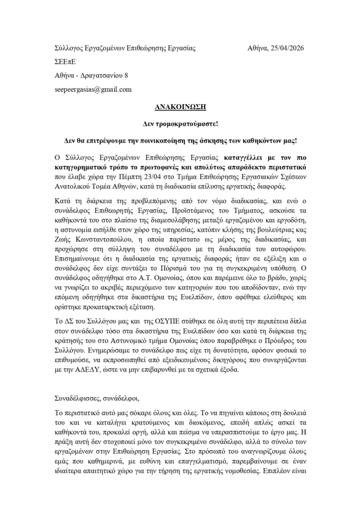 “Δεν θα επιτρέψουμε την ποινικοποίηση της άσκησης των καθηκόντων μας! Ο Σύλλογος Εργαζομένων Επιθεώρησης Εργασίας καταγγέλλει με τον πιο κατηγορηματικό τρόπο το πρωτοφανές και απολύτως απαράδεκτο περιστατικό που έλαβε χώρα την Πέμπτη 23/04 στο Τμήμα Επιθεώρησης Εργασιακών Σχέσεων Ανατολικού Τομέα Αθηνών, κατά τη διαδικασία επίλυσης εργατικής διαφοράς”, αναφέρουν αρχικά στην ανακοίνωσή τους.