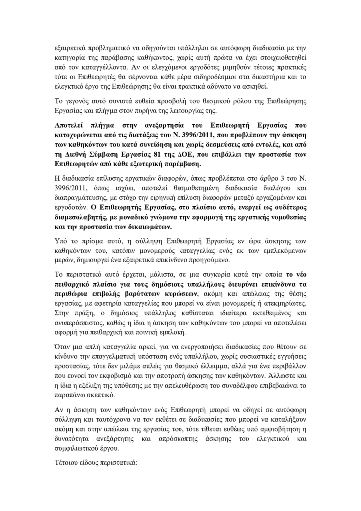 Αποτελεί πλήγμα στην ανεξαρτησία του Επιθεωρητή Εργασίας που κατοχυρώνεται από τις διατάξεις του Ν. 3996/2011, που προβλέπουν την άσκηση των καθηκόντων του κατά συνείδηση και χωρίς δεσμεύσεις από εντολές, και από τη Διεθνή Σύμβαση Εργασίας 81 της ΔΟΕ, που επιβάλλει την προστασία των Επιθεωρητών από κάθε εξωτερική παρέμβαση.