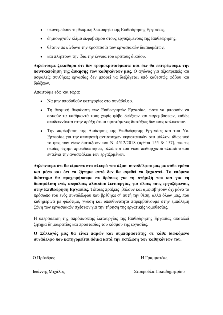 Δηλώνουμε ότι θα είμαστε στο πλευρό του άξιου συναδέλφου μας με κάθε τρόπο και μέσο και ότι το ζήτημα αυτό δεν θα αφεθεί να ξεχαστεί. Το επόμενο διάστημα θα προχωρήσουμε σε δράσεις για τη στήριξή του και για τη διασφάλιση ενός ασφαλούς πλαισίου λειτουργίας για όλους τους εργαζόμενους στην Επιθεώρηση Εργασίας. Τέτοιες πράξεις βάλουν και αμφισβητούν όχι μόνο το πρόσωπο του ενός συναδέλφου που βρέθηκε σ’ αυτή την θέση, αλλά όλων μας, που καθημερινά με φιλότιμο, γνώση και υπευθυνότητα παρεμβαίνουμε στην εμπόλεμη ζώνη των εργασιακών σχέσεων για την τήρηση της εργατικής νομοθεσίας.