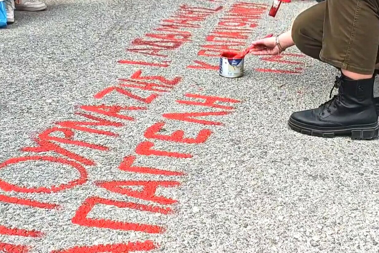 Διαδηλωτές βάφουν με μπογιά τα ονόματα των νεκρών στα Τέμπη απέναντι από τον χώρο διεξαγωγής της δίκης στη Λάρισα