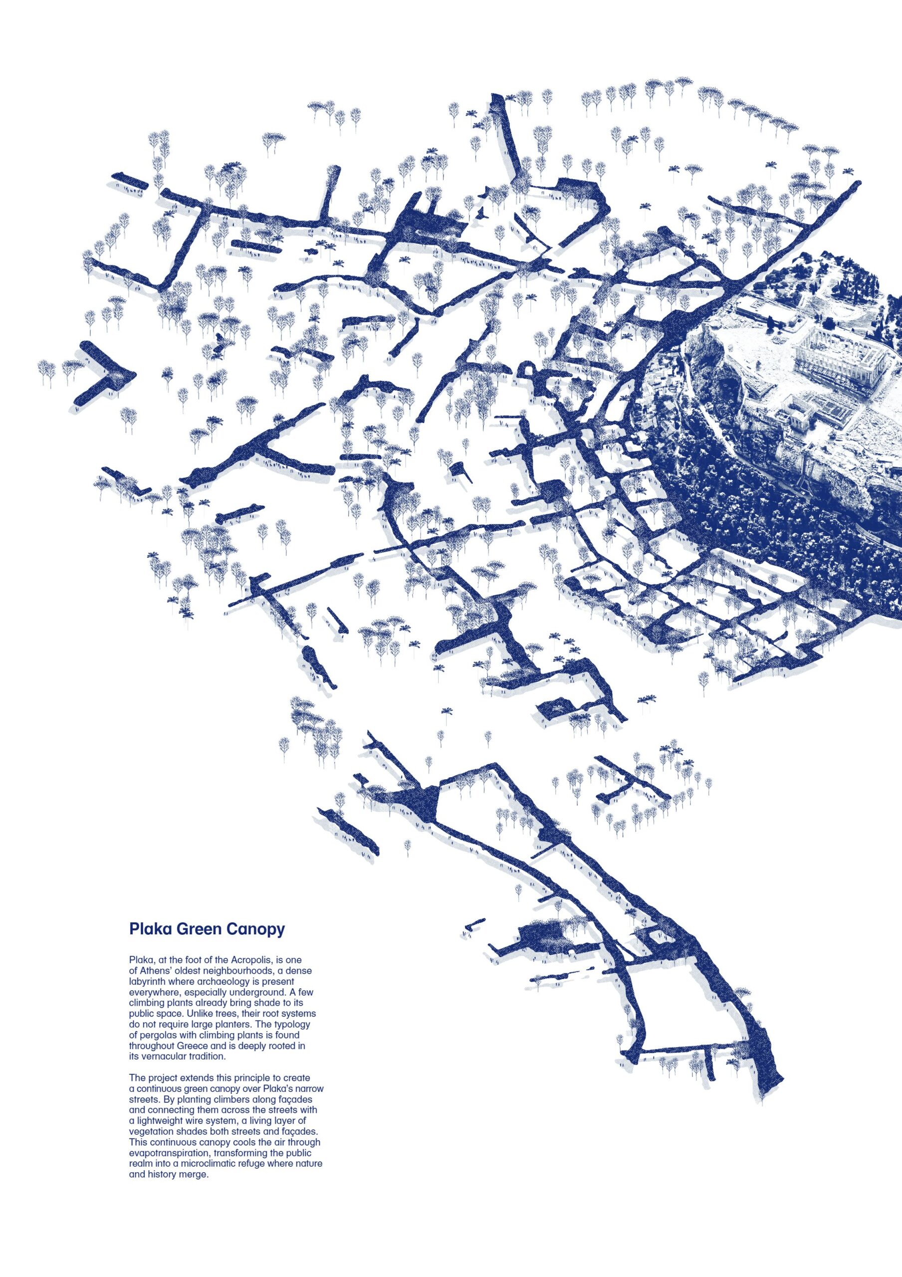 • Plaka Green Canopy: Με ένα δίκτυο αναρριχώμενων φυτών, που εκτείνεται στα σοκάκια της Πλάκας, δημιουργείται φυσική σκίαση στους δημόσιους χώρους και τις προσόψεις των κτιρίων.