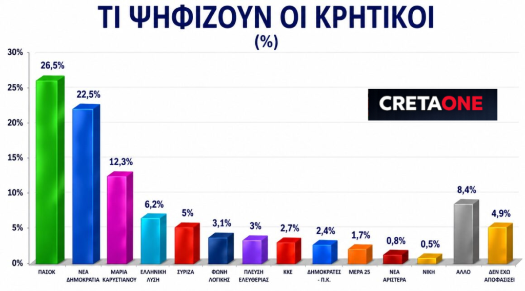 Πολιτικός σεισμός στη μεγαλόνησο από τη μέτρηση του Cretaone – Πώς το ΠΑΣΟΚ εκθρονίζει τη Νέα Δημοκρατία με 26,5% και την αφήνει στη δεύτερη θέση – Η εντυπωσιακή άνοδος της Μαρίας Καρυστιανού με διψήφιο ποσοστό (12,3%) – Γιατί ο ΣΥΡΙΖΑ του 5% βρίσκεται σε τροχιά ιστορικού αφανισμού στην Κρήτη