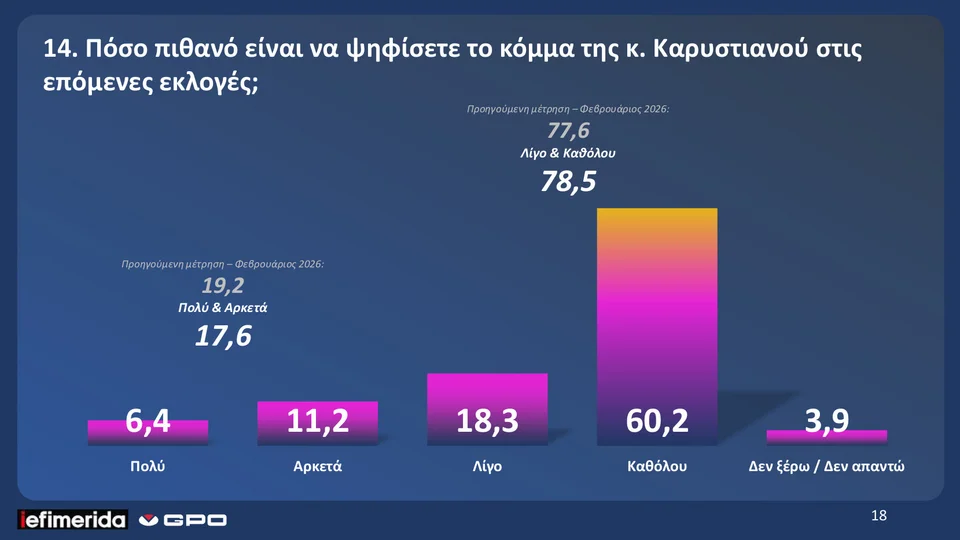 Στο ερώτημα πόσο πιθανό είναι να ψηφίσετε ένα κόμμα της κ. Καρυστιανού στις επόμενες εκλογές, μόνο το 6,4% απαντάει πολύ ενώ το 60,2% δηλώνει «καθόλου» πιθανό