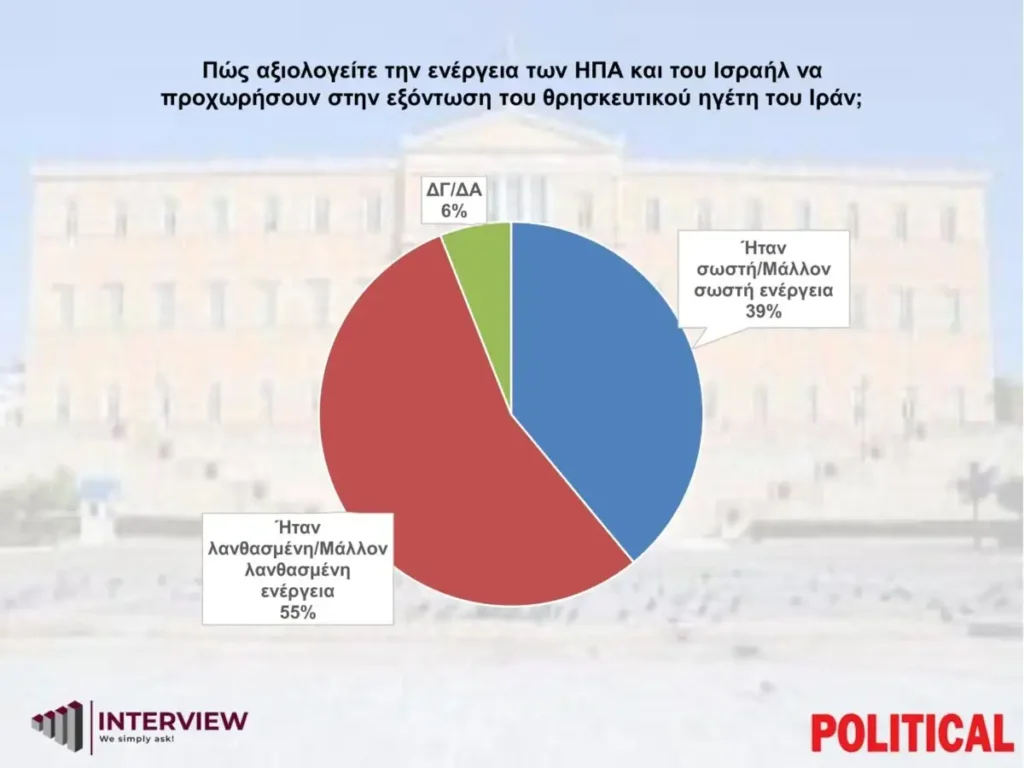 Στην ερώτηση «πώς αξιολογείτε την ενέργεια των ΗΠΑ και του Ισραήλ να προχωρήσουν στην εξόντωση του θρησκευτικού ηγέτη του Ιράν;», η πλειονότητα των ερωτηθέντων, σε ποσοστό 55%, τη θεωρεί λανθασμένη/μάλλον λανθασμένη, προφανώς, όπως προκύπτει από τις επόμενες απαντήσεις, όχι γιατί στηρίζει το θεοκρατικό καθεστώς της Τεχεράνης, αλλά διότι φοβάται τις οικονομικές συνέπειες και το «φρένο» στην αναπτυξιακή πορεία της χώρας. Σωστή/μάλλον σωστή ενέργεια τη χαρακτηρίζει το 39% των πολιτών, ενώ ΔΞ/ΔΑ λέει το 6%.