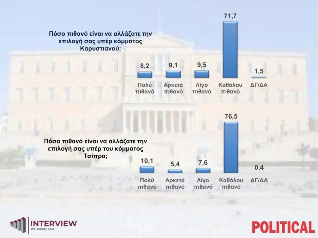 Σε ό,τι αφορά τον Αλέξη Τσίπρα, το 10,1% απαντά ότι είναι πολύ πιθανό να άλλαζε την επιλογή του υπέρ ενός κόμματος υπό την ηγεσία του και το 5,4% αρκετά πιθανό. Απεναντίας, το 76,5% απαντά ότι είναι απίθανο να άλλαζε την επιλογή του και το 7,6% λίγο πιθανό, ενώ ΔΞ/ΔΑ απαντά το 0,4%.