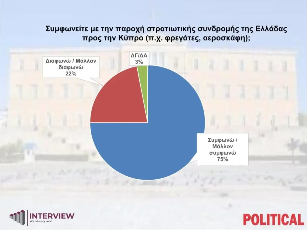Στον ερώτημα αν συμφωνούν με την παροχή στρατιωτικής συνδρομής της Ελλάδας προς την Κύπρο (πχ, φρεγάτες, αεροσκάφη), η στήριξη στις αποφάσεις της κυβέρνησης είναι συντριπτική, με το 75% των ερωτηθέντων να απαντά ότι συμφωνεί/μάλλον συμφωνεί, το 22% να διαφωνεί/μάλλον διαφωνεί, ενώ το 3% των ερωτηθέντων απαντά ΔΞ/ΔΕ.