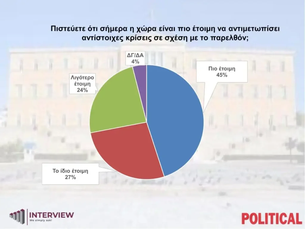 Στην ερώτηση αν πιστεύουν ότι η χώρα είναι πιο έτοιμη να αντιμετωπίσει αντίστοιχες κρίσεις σε σχέση με το παρελθόν, το 45% απαντά πιο έτοιμη, το 27% το ίδιο έτοιμη, το 24% λιγότερο έτοιμη και το 4% ΔΞ/ΔΑ.