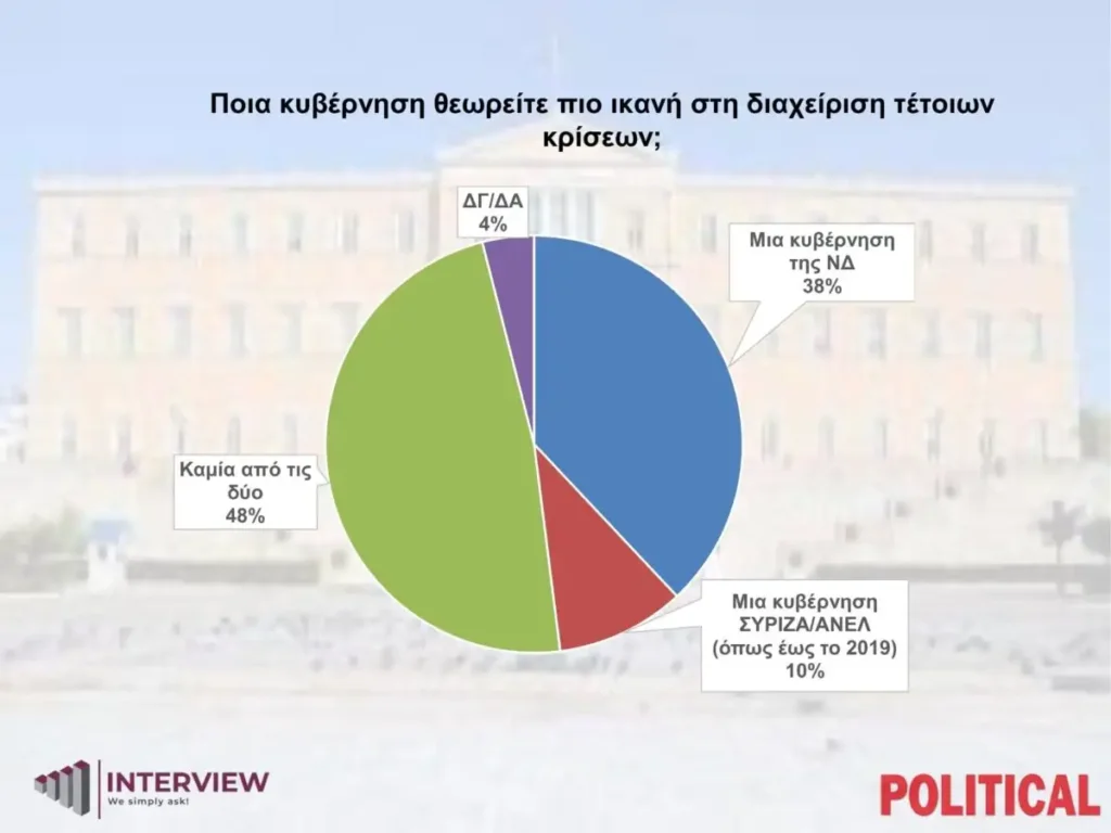Στην ερώτηση «ποια κυβέρνηση θεωρείτε πιο ικανή στη διαχείριση τέτοιων κρίσεων;», το 38% απαντά μια κυβέρνηση της ΝΔ, το 10% μια κυβέρνηση ΣΥΡΙΖΑ-ΑΝΕΛ (όπως το 2019), ενώ το 48% καμία από τις δύο και 4% ΔΞ/ΔΑ.