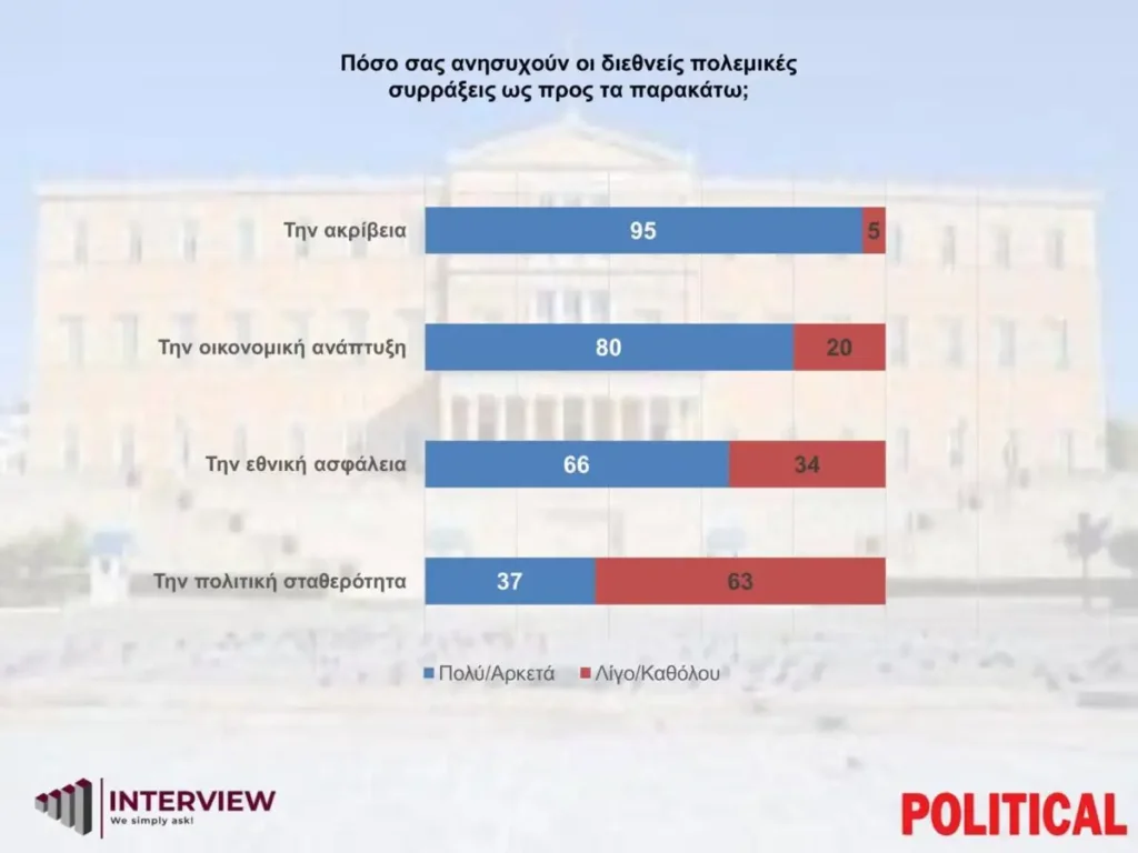 Οσοι συμμετείχαν στη δημοσκόπηση ρωτήθηκαν πόσο τους ανησυχούν οι διεθνείς πολεμικές συρράξεις. Ειδικότερα, το 95% απαντά ότι το ανησυχεί πολύ/αρκετά η ακρίβεια, έναντι μόλις 5% που απαντά λίγο/καθόλου. Πολύ/αρκετά ανησυχούν οι πολίτες για την οικονομική ανάπτυξη σε ποσοστό 80%, έναντι 20% που απαντούν λίγο/καθόλου.