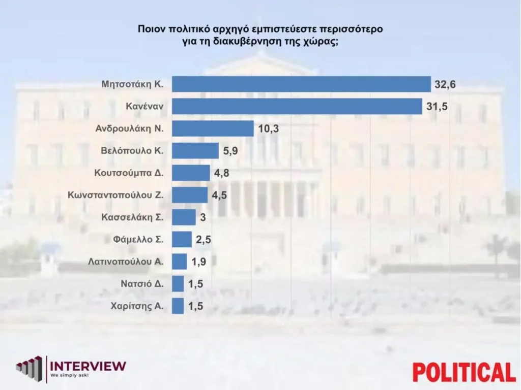 Στην ερώτηση «ποιον πολιτικό αρχηγό εμπιστεύεστε περισσότερο για τη διακυβέρνηση της χώρας;», ο πρωθυπουργός Κυριάκος Μητσοτάκης διατηρεί το προβάδισμα έναντι των υπόλοιπων αρχηγών των κομμάτων της αντιπολίτευσης.