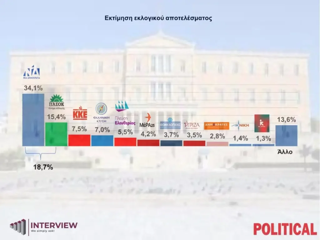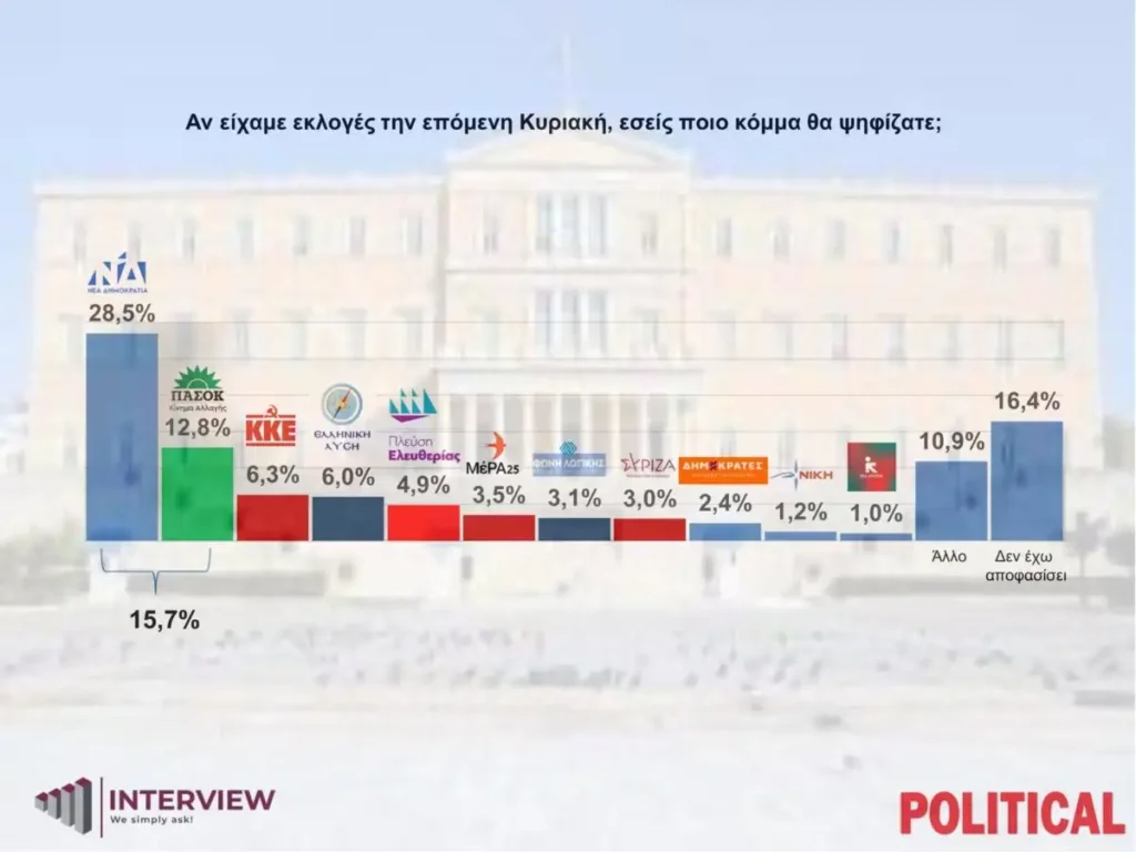 Στην ερώτηση «αν είχαμε εκλογές την επόμενη Κυριακή, εσείς ποιο κόμμα θα ψηφίζατε;», η ΝΔ λαμβάνει ποσοστό 28,5%, αυξημένο κατά σχεδόν δύο μονάδες σε σχέση με την προηγούμενη δημοσκόπηση της Interview.