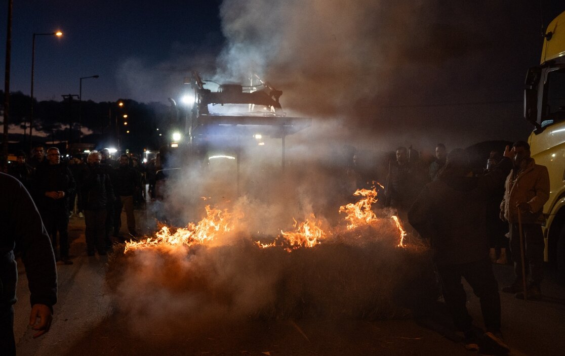 Ένταση στο μπλόκο της Θήβας, άναψαν φωτιές σε άχυρο όταν είδαν τα ΜΑΤ
