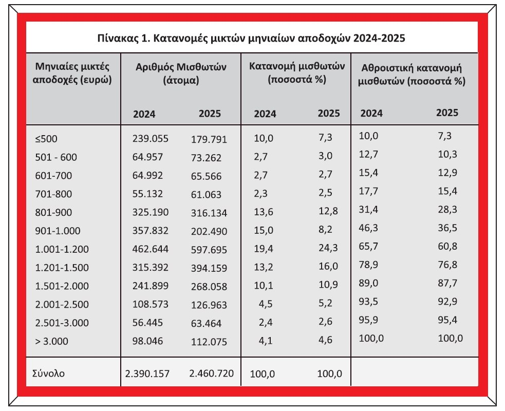 Το ποσοστό των μισθωτών με μικτές αποδοχές κάτω από 1.000 ευρώ μειώθηκε από 46,3% (περίπου 1,1 εκατ. άτομα) το 2024 σε 36,5% (περίπου 900 χιλ. άτομα) το 2025.