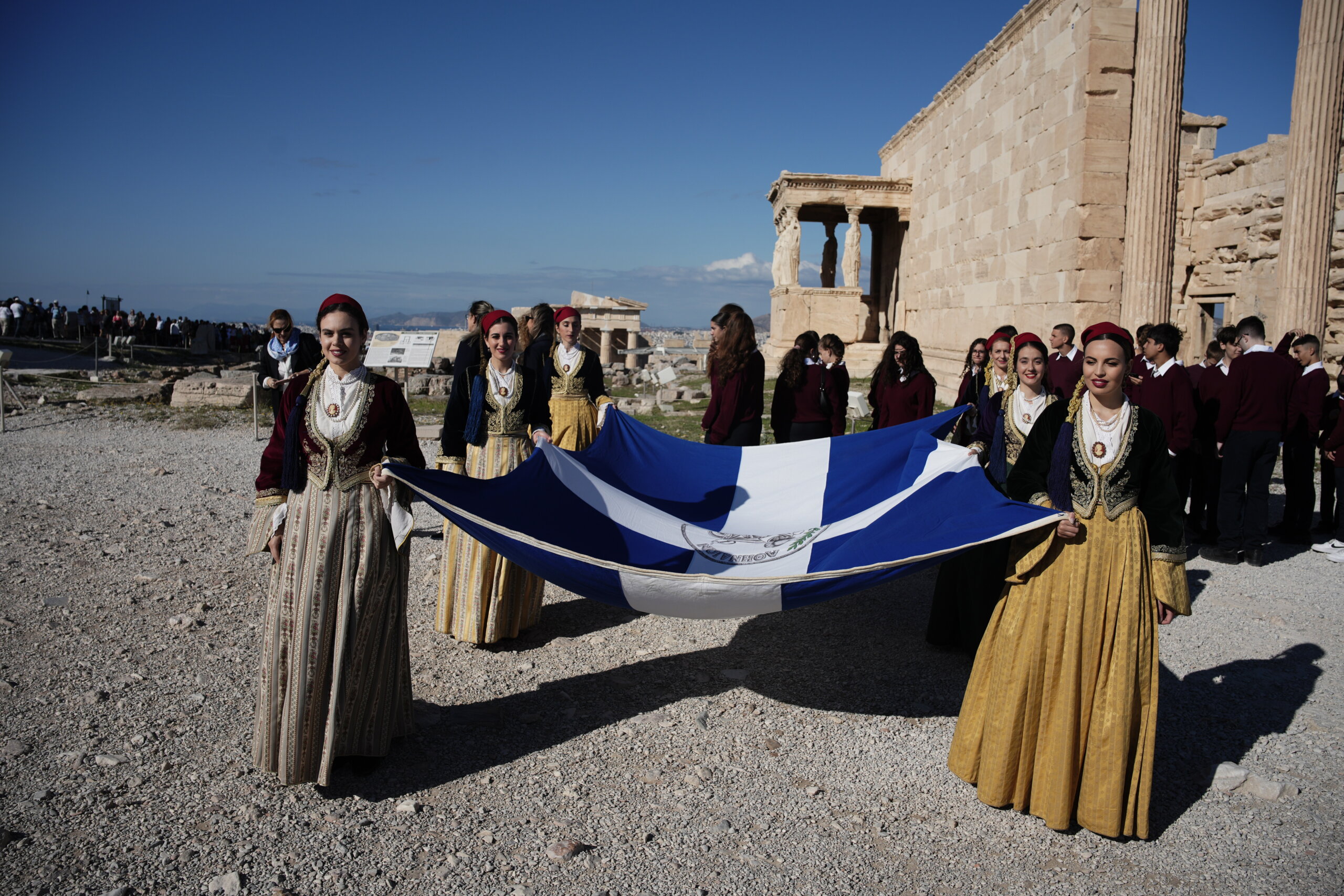 Έξι μέλη της χορευτικής ομάδας του Λυκείου Ελληνίδων με εθνικές ενδυμασίες, κρατώντας τη Σημαία της Απελευθέρωσης και πλαισιωμένα από μαθητές και μαθήτριες της Ιονίου Σχολής προσήλθαν στον ιστό.