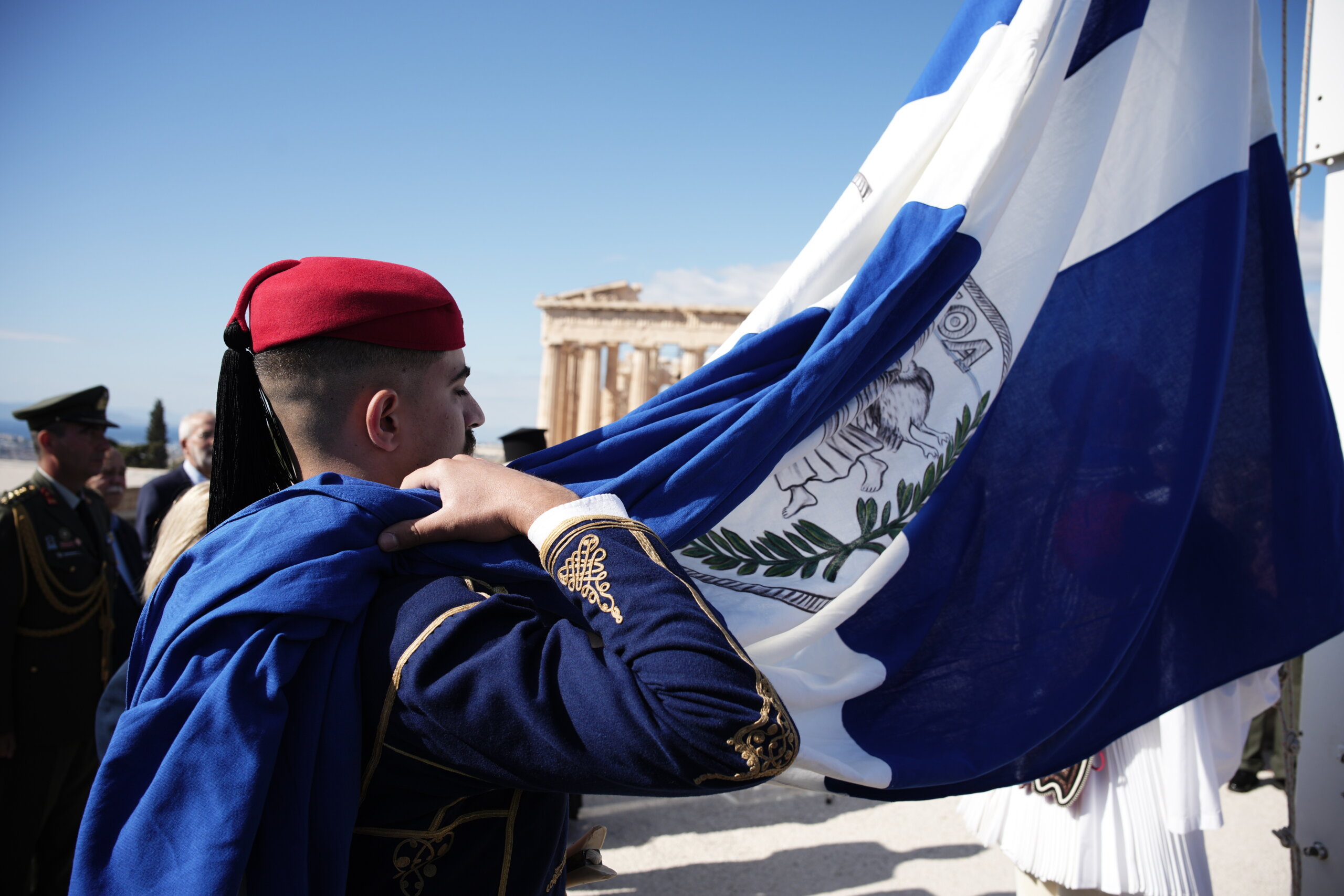 Η Σημαία παραδόθηκε από τα μέλη του Λυκείου Ελληνίδων στους άνδρες της Προεδρικής Φρουράς. Ακολούθησε η Έπαρση της Σημαίας από τους άνδρες της Προεδρικής Φρουράς (δύο βρακοφόροι κι ένας Εύζωνας), ενώ παιάνιζε ο Ύμνος της Σημαίας. Μετά την Έπαρση, η Μπάντα της Πολεμικής Αεροπορίας ανέκρουσε τον Εθνικό Ύμνο.