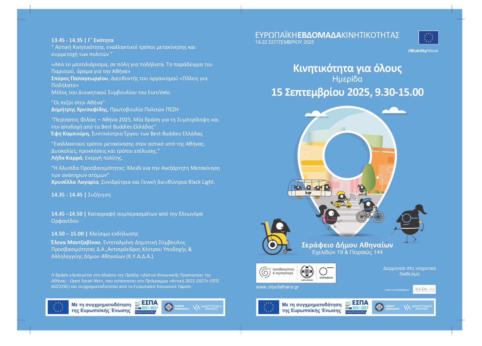 Ημερίδα με θέμα «Κινητικότητα για Όλους» – 15/9/25, Σεράφειο Δήμου Αθηναίων, 9:30–15:00: Παρουσίαση δράσεων και προγραμμάτων για τη βελτίωση της κινητικότητας στην Αθήνα και συζήτηση για προοπτικές, προκλήσεις και προβλήματα. Συμμετέχουν ο ΟΑΣΑ, η ΣΤΑΣΥ και φορείς που δραστηριοποιούνται στα πεδία της αναπηρίας και της κινητικότητας. Την ημερίδα συντονίζουν οι Ντάμες Σπαθί:  Ελευθερία Κουμάντου και Ελεωνόρα Ορφανίδου, ενώ θα υπάρχει διερμηνεία στην Ελληνική Νοηματική Γλώσσα.