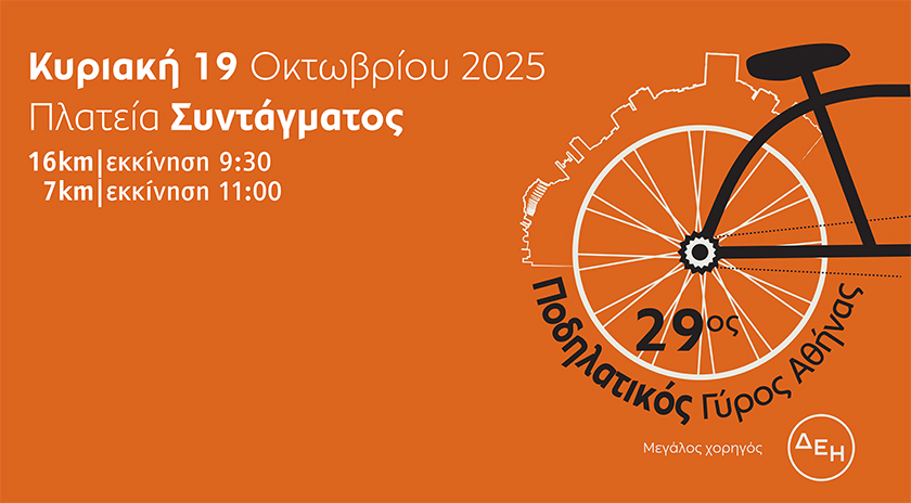 Ο Δήμος Αθηναίων δίνει το σύνθημα για μία μεγάλη γιορτή του αθλητισμού και της πόλης. Την Κυριακή 19 Οκτωβρίου 2025, η Αθήνα υποδέχεται τον 29ο Ποδηλατικό Γύρο, μια διοργάνωση του Οργανισμού Πολιτισμού, Αθλητισμού & Νεολαίας (ΟΠΑΝΔΑ), με την υποστήριξη της ΔΕΗ ως μεγάλου χορηγού.