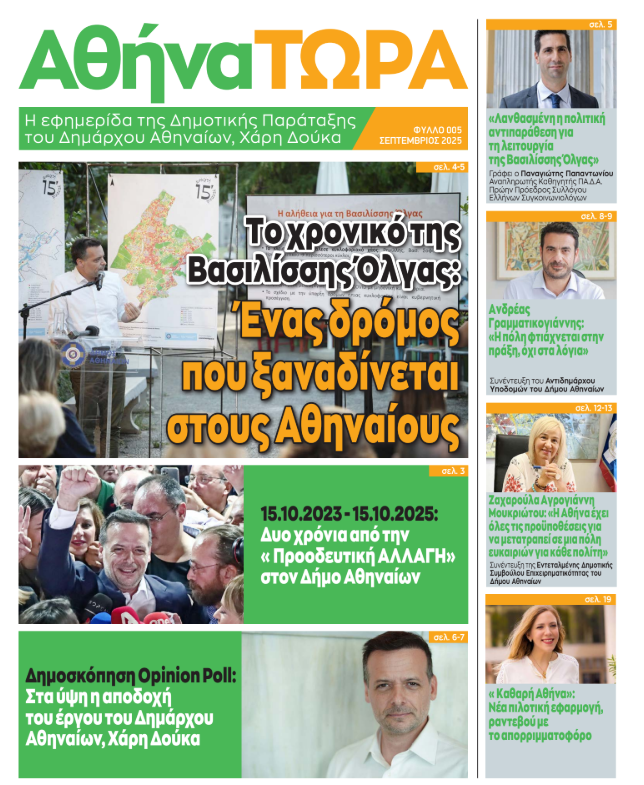 Στις σελίδες της εφημερίδας θα διαβάσετε για την ιστορική απόφαση του Δημάρχου Χάρη Δούκα να επιστρέψει η Βασιλίσσης Όλγας στους πολίτες, για τα έργα που αλλάζουν την καθημερινότητα, για τη ραγδαία άνοδο της αποδοχής του έργου του Δημάρχου, αλλά και για το όραμα μιας Αθήνας που ανήκει σε όλους.
