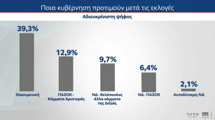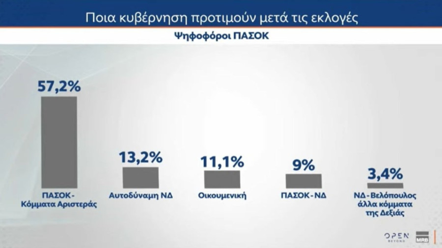 Αξίζει μάλιστα να σημειωθεί πως στην αδιευκρίνιστη ψήφο η επιλογή της Κυβέρνησης του ΠΑΣΟΚ με τα κόμματα της Κεντρο-Αριστεράς είναι στη 2η θέση με 13% ενώ εκεί η αυτοδύναμη Κυβέρνηση της Νέας Δημοκρατίας είναι στην τελευταία θέση με 2%