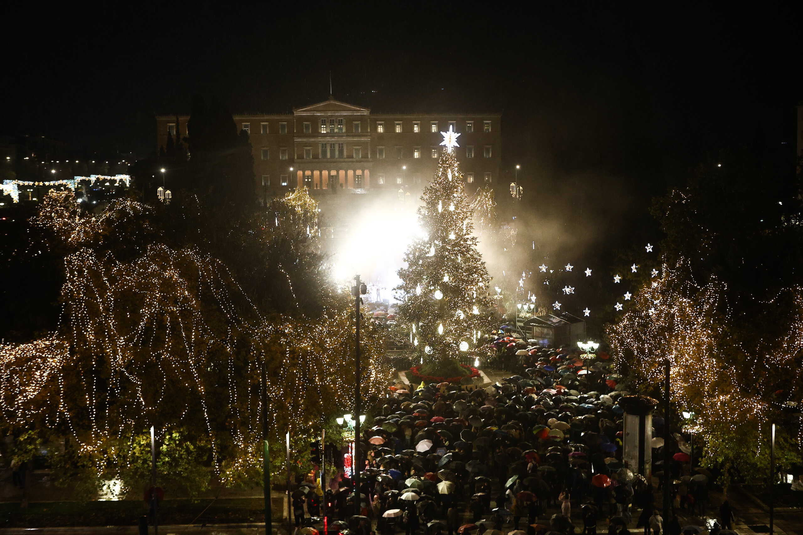 Άναψε το Χριστουγεννιάτικο δέντρο της Αθήνας στο Σύνταγμα – Υπό βροχή οι εκδηλώσεις