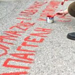Διαδηλωτές βάφουν με μπογιά τα ονόματα των νεκρών στα Τέμπη απέναντι από τον χώρο διεξαγωγής της δίκης στη Λάρισα