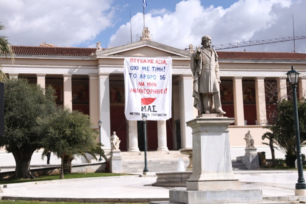 Στις 12 το μεσημέρι χιλιάδες μαθητές και φοιτητές κατέβηκαν στο οδόστρωμα της Πανεπιστημίου, μπροστά από τα Προπύλαια για την πορεία τους προς το Σύνταγμα.
