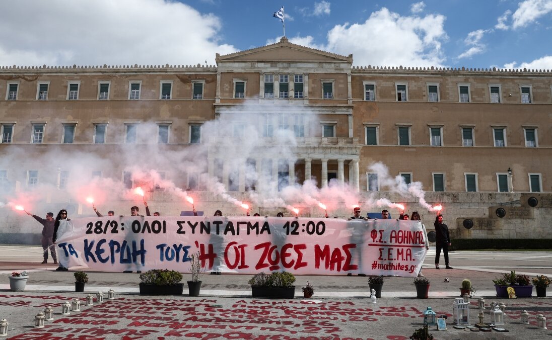 Σύμφωνα με το parallaxi, φοιτητικοί σύλλογοι και μαθητές συγκεντρώθηκαν στο άγαλμα Βενιζέλου, με αφορμή τα τρία χρόνια από το σιδηροδρομικό δυστύχημα των Τεμπών, όπου με πανό και πλακάτ διαμαρτυρήθηκαν και φώναξαν «τα κέρδη τους ή οι ζωές μας».