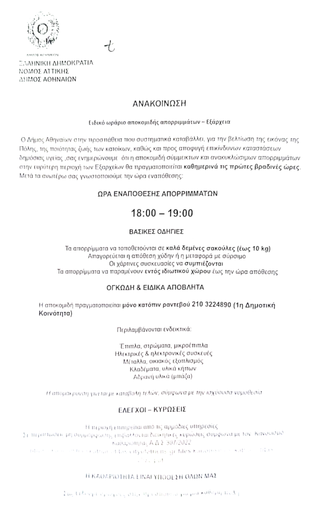 Σύμφωνα με την ανακοίνωση, οι κάτοικοι θα πρέπει να τοποθετούν τα απορρίμματά τους στους κάδους αποκλειστικά μεταξύ 18:00 και 19:00.