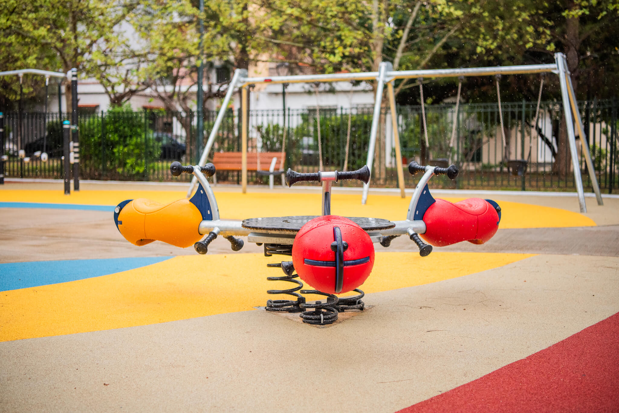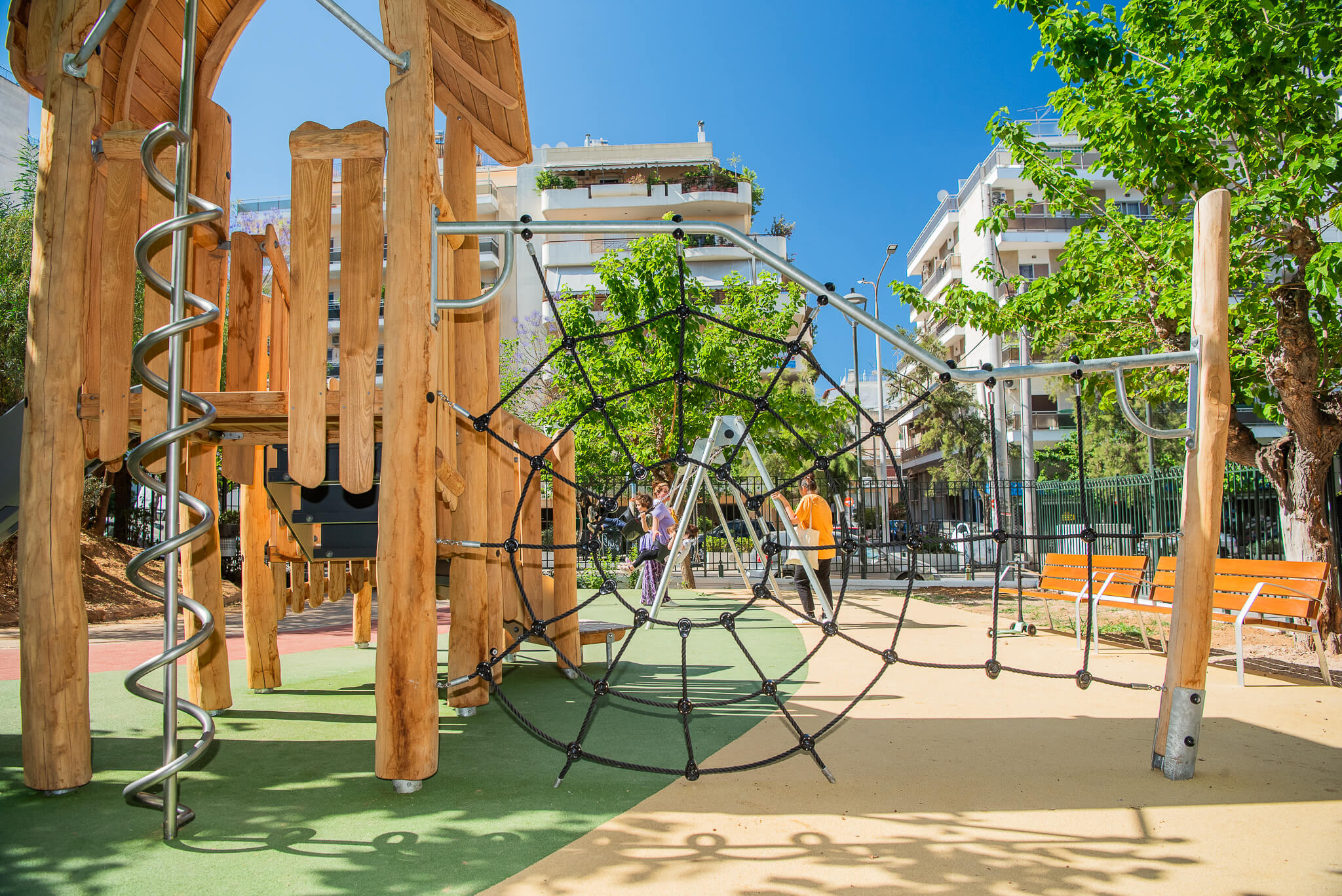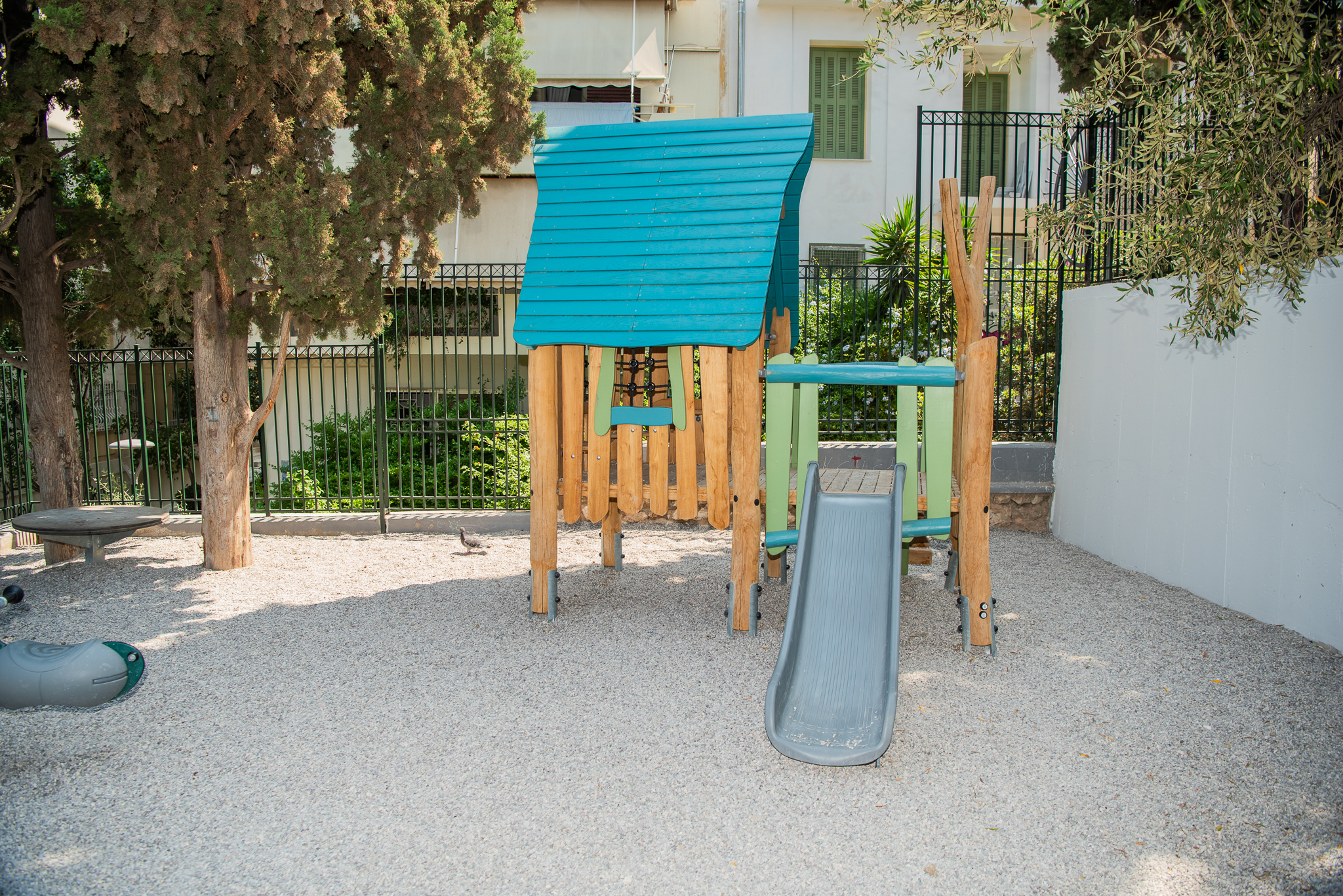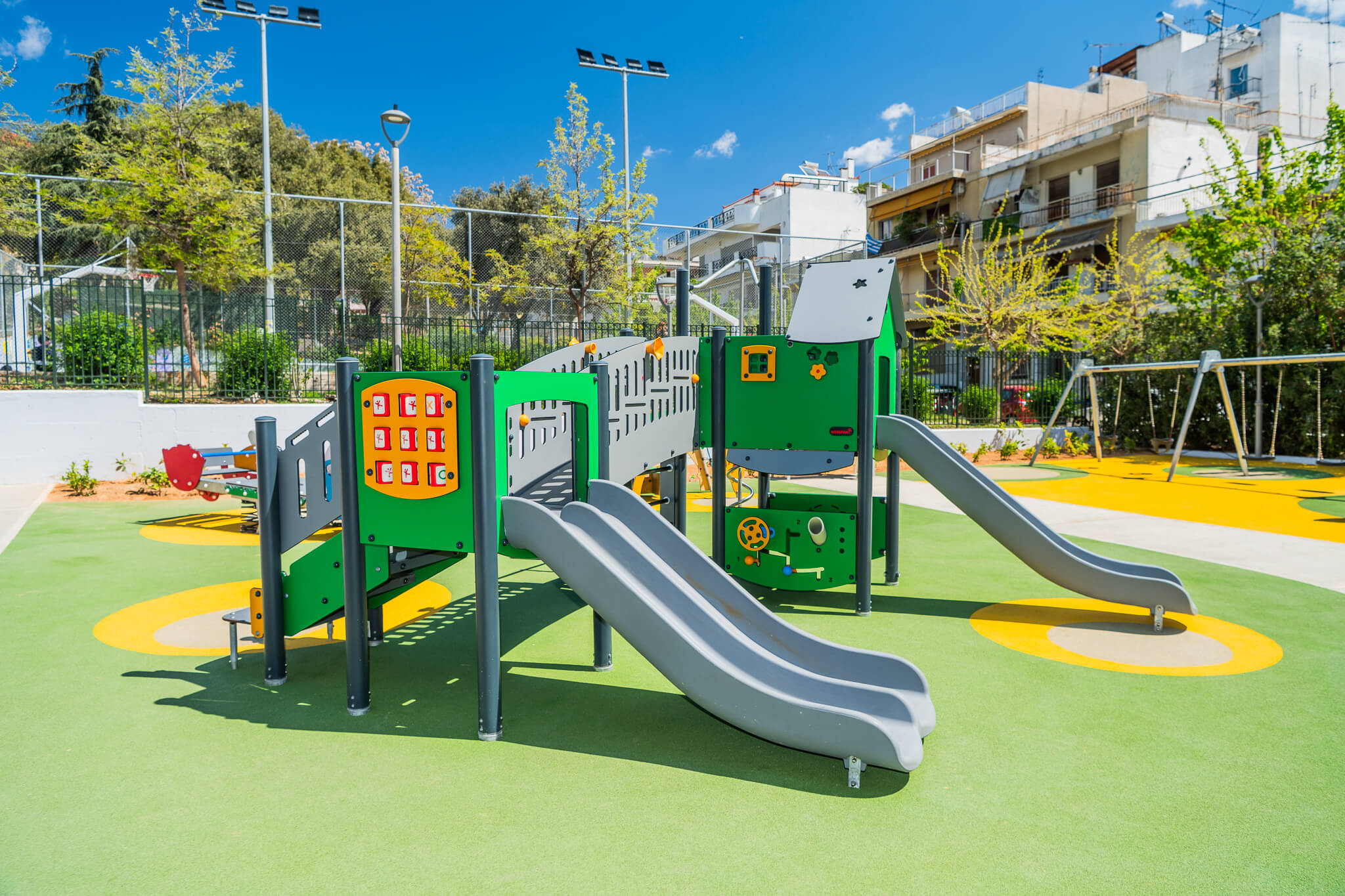 Παράλληλα, έχουν προβλεφθεί σημεία φυσικής σκίασης από τα δέντρα, παγκάκια για τους συνοδούς, βρύσες με πόσιμο νερό, κάδοι απορριμμάτων, ενώ εξασφαλίζεται πλήρης πρόσβαση για ΑμεΑ μέσω ειδικά διαμορφωμένων ραμπών. Οι χώροι πληρούν τα ευρωπαϊκά πρότυπα ασφαλείας ΕΛΟΤ ΕΝ 1176 και έχουν πιστοποιηθεί από τον ανεξάρτητο φορέα OCTOCERT, εξασφαλίζοντας ένα απόλυτα προστατευμένο περιβάλλον.