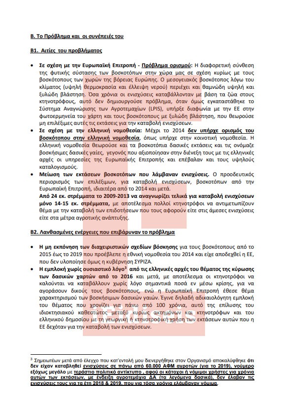Στη συνέχεια ο κ. Βάρρας, αφού περιγράφει το ιστορικό της καταβολής των ενισχύσεων, αναφέρεται στις αιτίες του προβλήματος. Μια εξ αυτών είναι ότι έως το 2014, «η ελληνική νομοθεσία θεωρούσε και τα βοσκοτόπια δασικές εκτάσεις και τις ονόμαζε βοσκήσιμες δασικές γαίες, γεγονός που αξιοποίησαν στην διένεξή τους με τις ελληνικές αρχές οι υπηρεσίες της Ευρωπαϊκής Επιτροπής και επέβαλαν και τους υψηλούς καταλογισμούς».