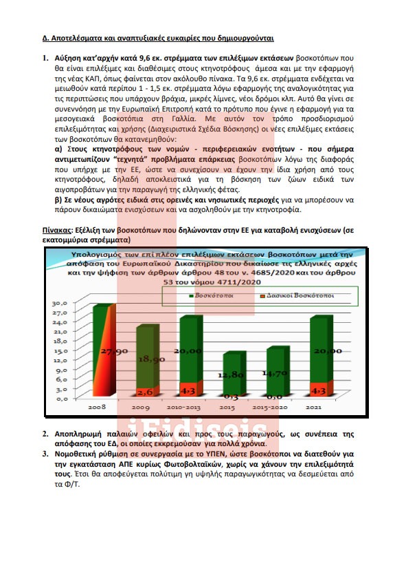 Ως αποτέλεσμα, υπήρξε «αύξηση κατ’ αρχήν κατά 9,6 εκ. στρέμματα των επιλέξιμων εκτάσεων βοσκοτόπων που θα είναι επιλέξιμες και διαθέσιμες στους κτηνοτρόφους άμεσα και με την εφαρμογή της νέας ΚΑΠ… Τα 9,6 εκ. στρέμματα ενδέχεται να μειωθούν κατά περίπου 1 – 1,5 εκ. στρέμματα λόγω εφαρμογής της αναλογικότητας για τις περιπτώσεις που υπάρχουν βράχια, μικρές λίμνες, νέοι δρόμοι κλπ…».