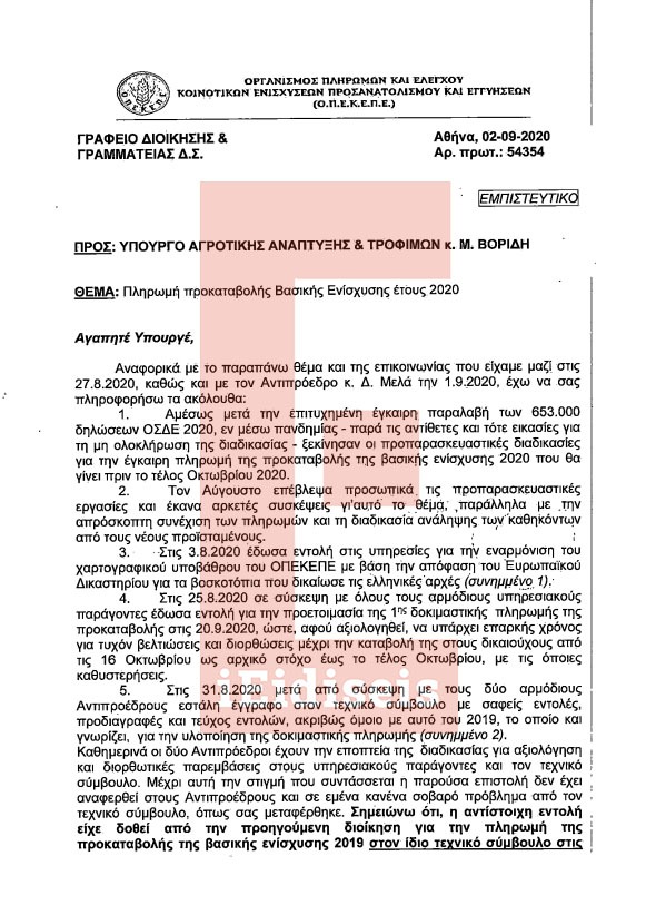 Στις 2 Σεπτεμβρίου 2020, ο Γρηγόρης Βάρρας αποστέλλει εμπιστευτική επιστολή προς τον Μάκη Βορίδη για να τον ενημερώσει για την πληρωμή προκαταβολής της βασικής ενίσχυσης του 2020. Όπως σημειώνεται στην επιστολή, λίγες μέρες νωρίτερα, ο κ. Βάρρας είχε επικοινωνία για τον ζήτημα με τον κ. Βορίδη και τον τότε αντιπρόεδρο του ΟΠΕΚΕΠΕ, Δημήτρη Μελλά.