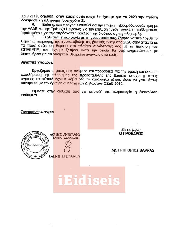 Μάλιστα, στο τέλος της επιστολής του ο κ. Βάρρας ενημέρωση πως «σε χθεσινή επικοινωνία με τη γραμματεία σας, ζήτησα να περιληφθεί το θέμα της πληρωμής της προκαταβολής της βασικής ενίσχυσης 2020 στη ατζέντα με τα προς συζήτηση θέματα στο πλαίσιο συνάντησής σας με τη Διοίκηση του ΟΠΕΚΕΠΕ, που έχουμε ζητήσει, κατά την οποία θα σας ενημερώσουμε με λεπτομέρεια για οτιδήποτε θεωρείται αναγκαίο από εσάς».