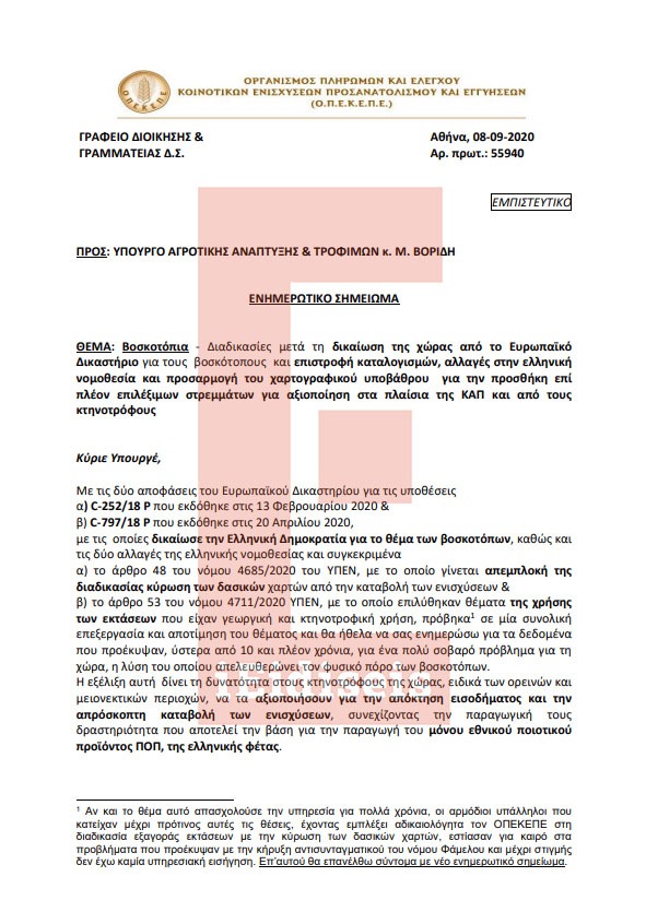 Στο δεύτερο ενημερωτικό σημείωμα που απέστειλε προς τον Μάκη Βορίδη στις 8 Σεπτεμβρίου 2020, ο κ. Βάρρας αναφέρεται μεταξύ άλλων σε δύο αποφάσεις του Ευρωπαϊκού Δικαστηρίου που εκδόθηκαν το 2020. Όπως σημειώνεται στο ενημερωτικό σημείωμα, το Ευρωπαϊκό Δικαστήριο «δικαιώνει τις ελληνικές αρχές και υποχρεώνει την Ευρωπαϊκή Επιτροπή να επιστρέψει στη χώρα μας 466 εκ. ευρώ για τους καταλογισμούς μέχρι το 2013. Το Ευρωπαϊκό Δικαστήριο αναγνωρίζει ότι η χώρα μας έχει δίκιο για τον ορισμό του μεσογειακού βοσκότοπου που αποτελείται και από ξυλώδη βλάστηση και όχι μόνο ποώδη».