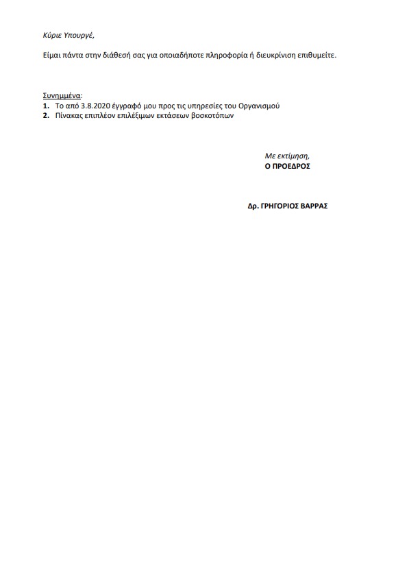 Παράλληλα, στην επιστολή του, ο κ. Βάρρας αναφέρεται μεταξύ άλλων και σε νόμο του Υπουργείου Περιβάλλοντος και Ενέργειας, με τον οποίο «επιλύθηκαν θέματα της χρήσης των εκτάσεων που είχαν γεωργική και κτηνοτροφική χρήση».