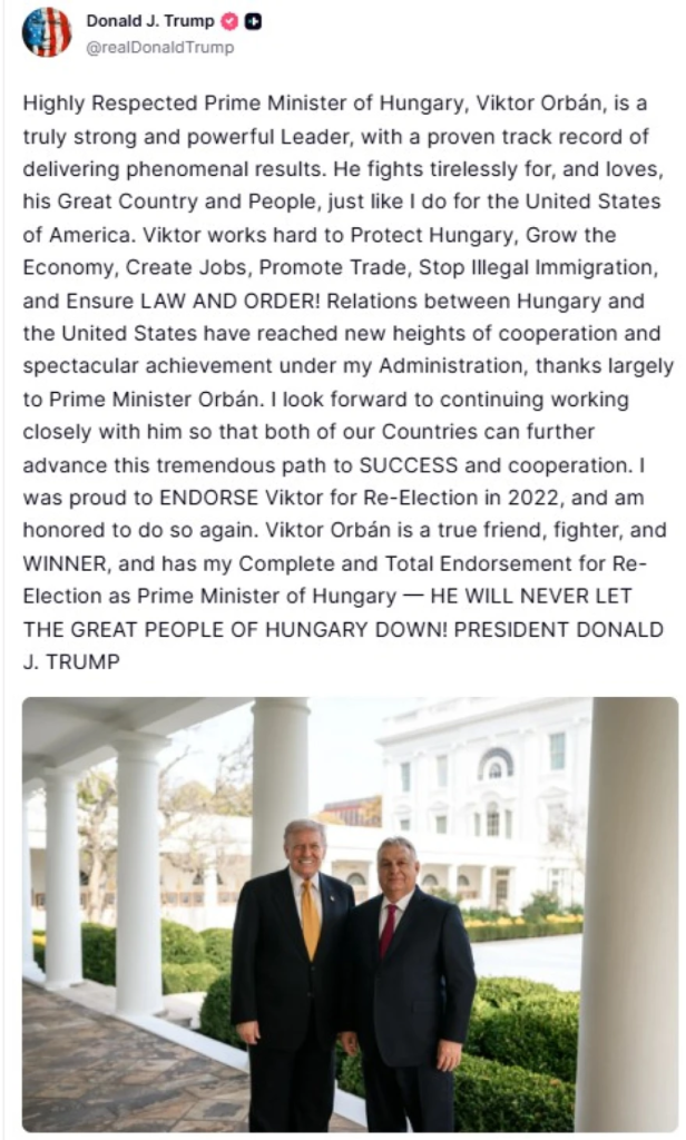 “Ο Βίκτορ Όρμπαν είναι ένας πραγματικός φίλος, ένας αγωνιστής και ένας νικητής, και έχει την πλήρη και αμέριστη υποστήριξή μου για την επανεκλογή του ως πρωθυπουργός της Ουγγαρίας – ΔΕΝ ΘΑ ΑΦΗΣΕΙ ΠΟΤΕ ΤΟΝ ΣΠΟΥΔΑΙΟ ΛΑΟ ΤΗΣ ΟΥΓΓΑΡΙΑΣ”, έγραψε ο Αμερικανός πρόεδρος στο δίκτυό του Truth Social.