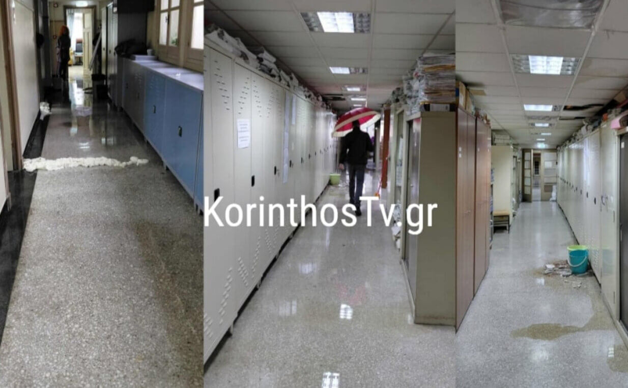 Σύμφωνα με το korinthostv.gr η έντονη βροχόπτωση προκάλεσε εισροή υδάτων από την οροφή, με αποτέλεσμα οι διάδρομοι να γεμίσουν νερά, αλλά και υπάλληλοι και πολίτες να κυκλοφορούν μέσα στο κτίριο κρατώντας ακόμη και ομπρέλες!