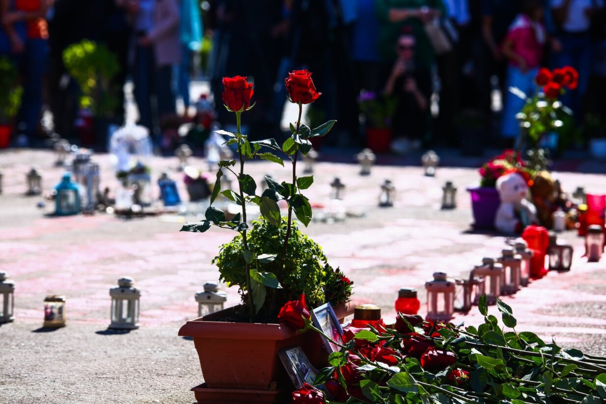 Λίγα λεπτά μετά τη λήξη της μαθητικής παρέλασης στην πλατεία Συντάγματος, πλήθος κόσμου απέτισε φόρο τιμής στο μνημείο των θυμάτων των Τεμπών, αφήνοντας λουλούδια.
