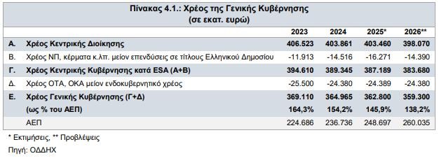Ο κ. υπουργός Οικονομικών στον πίνακα 4.1 της Εισηγητικής του Έκθεσης για τον Προϋπολογισμό 2026 βεβαιώνει ότι το κρατικό χρέος, το οποίο ονομάζει χρέος Κεντρικής Διοίκησης, στις 31.12.24 ήταν 403,5 δισ.