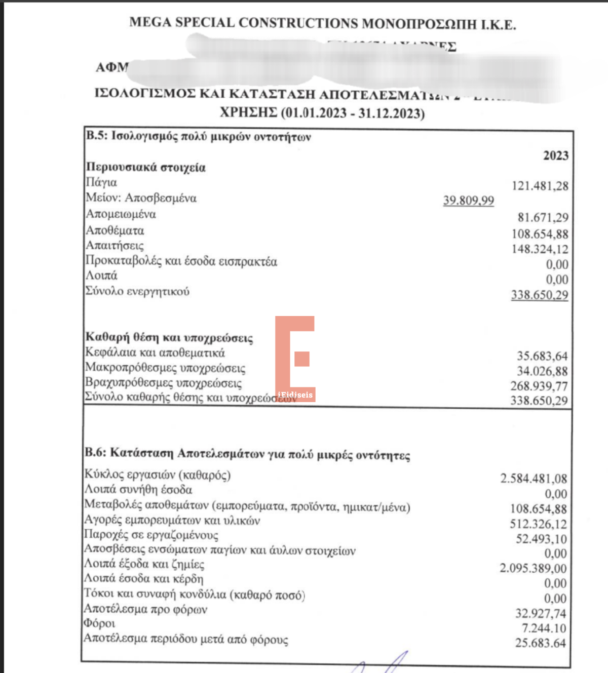 Αρχικά το 2023 δεν είχε δημοσιευτεί ισολογισμός της εταιρίας, με αποτέλεσμα το ΓΕΜΗ να θέσει την εταιρία σε αναστολή καταχώρισης. Στη συνέχεια και με καθυστέρηση δημοσιεύτηκε ο ισολογισμός του 2023 και έτσι έγινε άρση της αναστολής. Στον ισολογισμό αυτόν για το 2023 αναφέρεται ότι το σύνολο του ενεργητικού είναι 338.650 ευρώ, ενώ ο κύκλος εργασιών ανέρχεται στα 2.584.481 ευρώ.