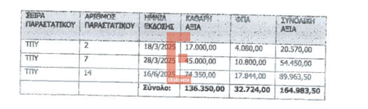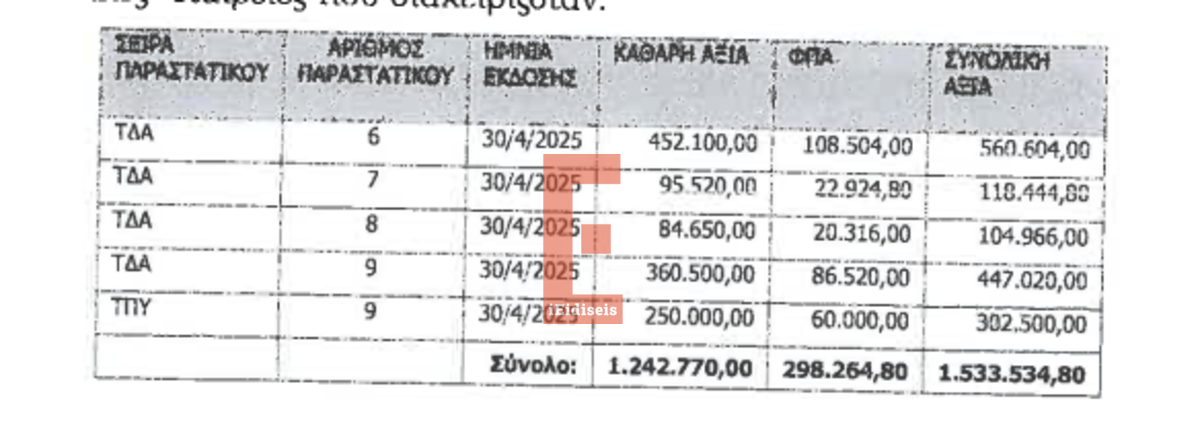 Από την άρση του τραπεζικού απορρήτου των λογαριασμών της κατασκευαστικής εντοπίστηκαν πέντε εικονικά τιμολόγια που εκδόθηκαν τον Απρίλιο του 2025 προς την εταιρία του Νίκου Κοκλώνη ύψους 1,5 εκατομμυρίου ευρώ.