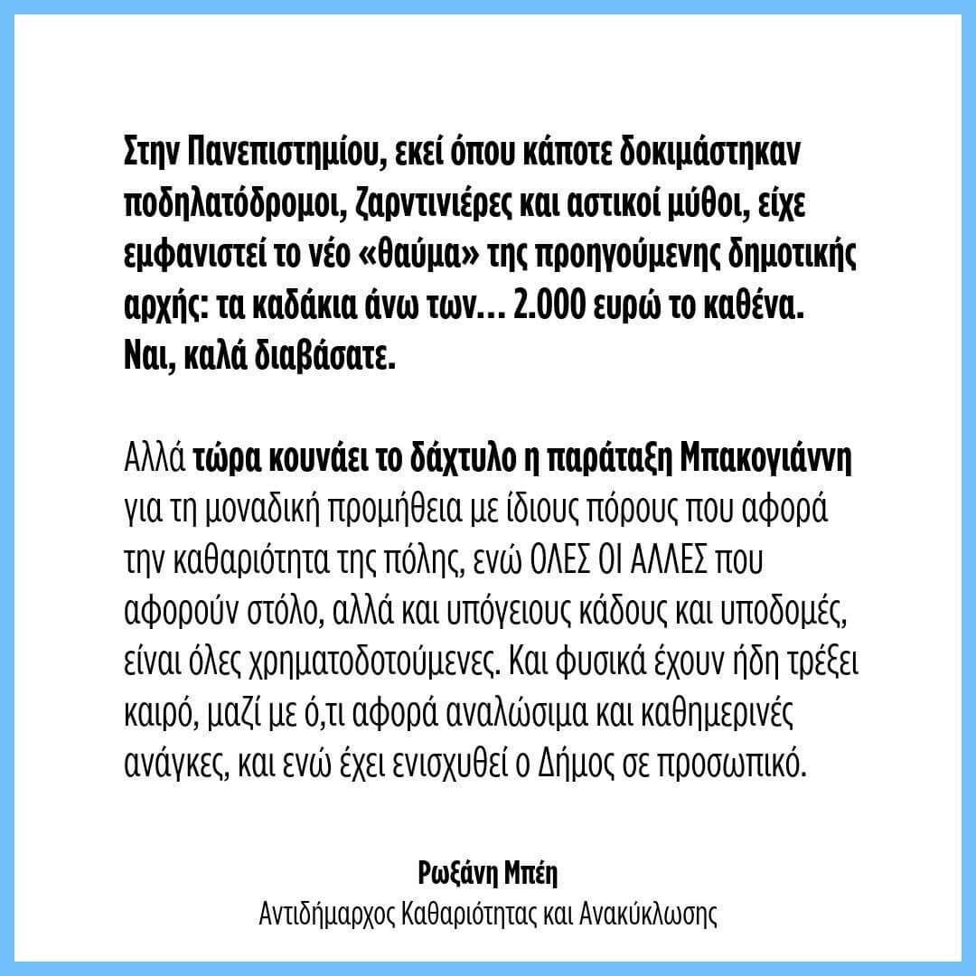 Μάλιστα, τολμούν να μιλάνε για τιμές όταν το απλό καδάκι που τοποθετήθηκε στην Πανεπιστημίου κόστισε πάνω από 2000 ευρώ, ενώ ο κάδος με το ειδικό σύστημα για αεροστεγή σφράγιση και καταπολέμηση οσμών, για να αντιμετωπιστεί το διαχρονικό ζήτημα του περιμαζέματος και της σωστής απόρριψης περιττωμάτων ζώων, συν την εργασία της τοποθέτησης, κόστισε 1.080 ευρώ ανά τεμάχιο.