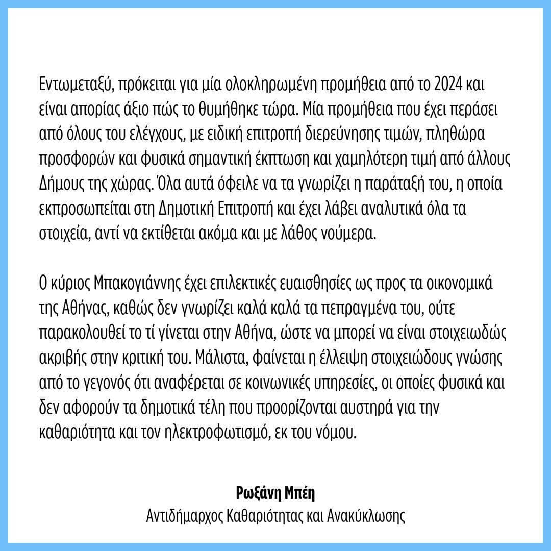 Ο κύριος Μπακογιάννης έχει επιλεκτικές ευαισθησίες ως προς τα οικονομικά της Αθήνας, καθώς δεν γνωρίζει καλά καλά τα πεπραγμένα του, ούτε παρακολουθεί το τί γίνεται στην Αθήνα, ώστε να μπορεί να είναι στοιχειωδώς ακριβής στην κριτική του. Μάλιστα, φαίνεται η έλλειψη στοιχειώδους γνώσης από το γεγονός ότι αναφέρεται σε κοινωνικές υπηρεσίες, οι οποίες φυσικά και δεν αφορούν τα δημοτικά τέλη που προορίζονται αυστηρά για την καθαριότητα και τον ηλεκτροφωτισμό, εκ του νόμου.