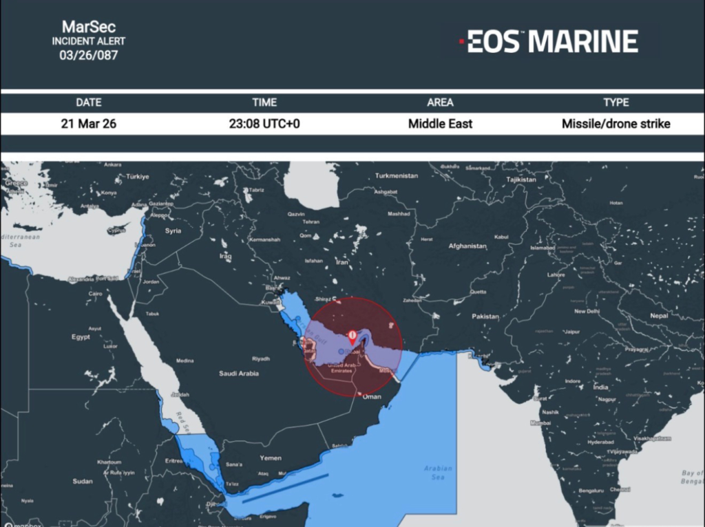 Σοβαρό περιστατικό ασφαλείας καταγράφηκε στις 21 Μαρτίου 2026 και ώρα 23:08 (UTC), στην ευρύτερη θαλάσσια περιοχή των Ηνωμένων Αραβικών Εμιράτων, εντείνοντας την ανησυχία για την ασφάλεια της ναυσιπλοΐας στον Κόλπο.