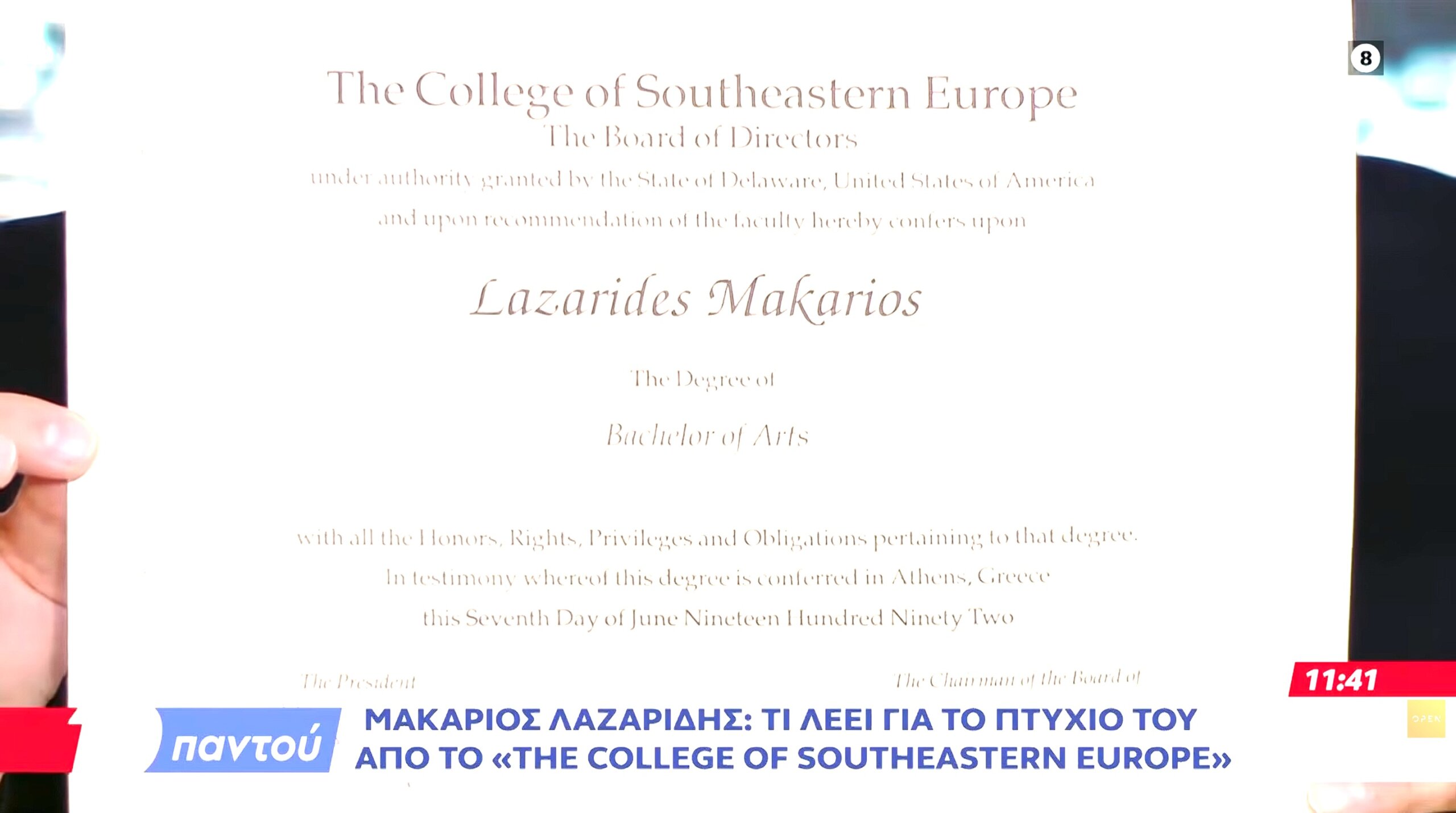 «Το 1987 έκανα μία συνειδητή επιλογή, σε ηλικία 18 ετών, να σπουδάσω σε ένα κολέγιο, στο κολέγιο of the Southeastern Europe, ένα από τα δύο μεγαλύτερα κολέγια τότε στην Ελλάδα. Αποφοίτησα το 1992, αυτό είναι το πτυχίο μου», είπε ο υφυπουργός Αγροτικής Ανάπτυξης Μακάριος Λαζαρίδης, απαντώντας για το πτυχίο του.