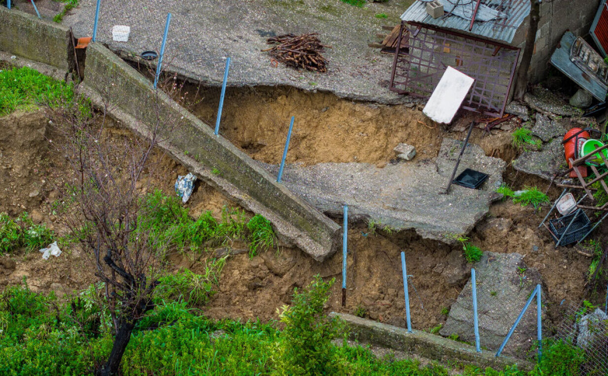 Μια ολόκληρη πλαγιά υποχωρεί, βάζοντας σε κίνδυνο τις κατοικίες, ενώ ήδη έχει καταστραφεί μέρος του δρόμου.
